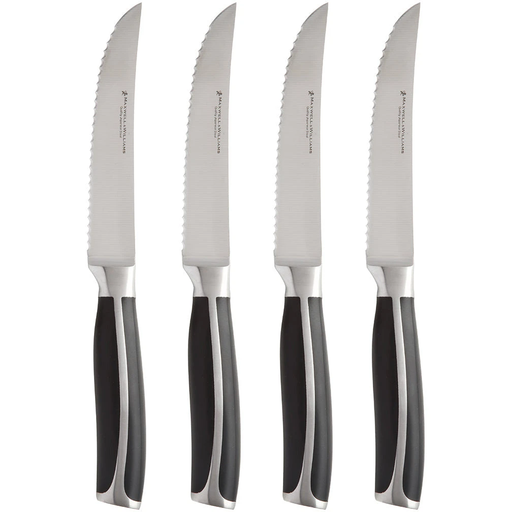 Stanton steak knives are designed with a serrated edge, helping you slice through tough meats without compromising quality. With a selection of handles to choose from €°ö_ÌÇ wooden, black, or stainless steel €°ö_ÌÇ every knife set showcases superior strength and durability with their Japanese stainless steel.